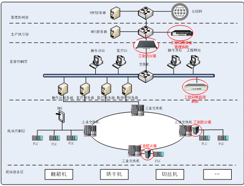 在烟厂各车间工业控制系统生产网和管理网边界部署工业防火墙进行管理网和生产网的逻辑隔离,对两网间数据交换进行安全防护,确保生产网不会引入管理网所面临风险。