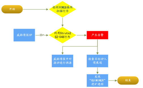 2017年10月14日22时,在某企业安管平台发现了“L3_ADS_Struts2_S2_048漏洞利用”告警事件,该告警由之前定义的“L3_ADS_Struts2_S2_048漏洞利用”关联规则触发。北斗服务人员依托泰合安管平台并结合威胁情报信息,迅速对攻击告警过程进行追溯和分析,发现其WEB应用系统被攻击后植入GUIMINER恶意程序。