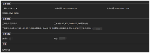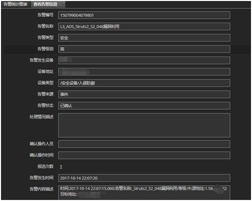 2017年10月14日 22时,该企业用户收到安全管理平台产生的 L3_ADS_Struts2_S2_048漏洞利用”告警。
