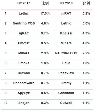 Cutwail、Lethic以及新版Emotet bots也都扎根在Top 10中。