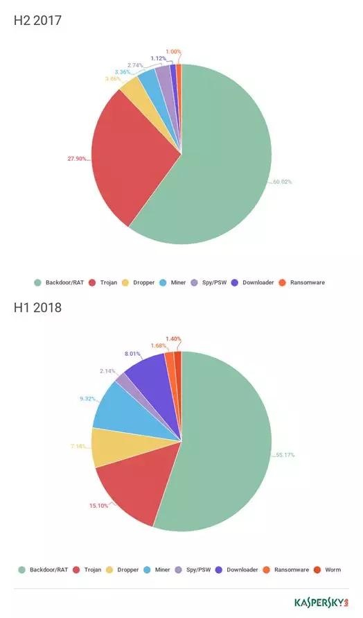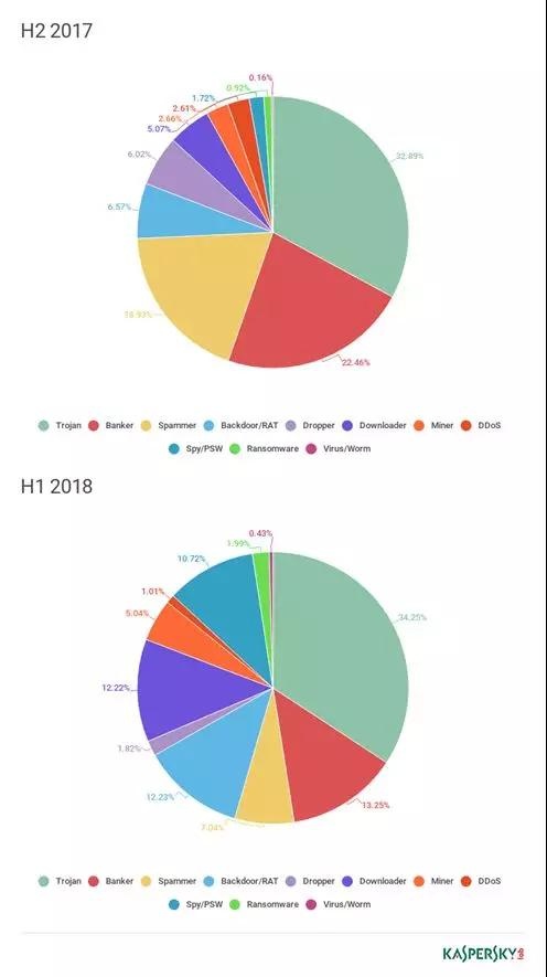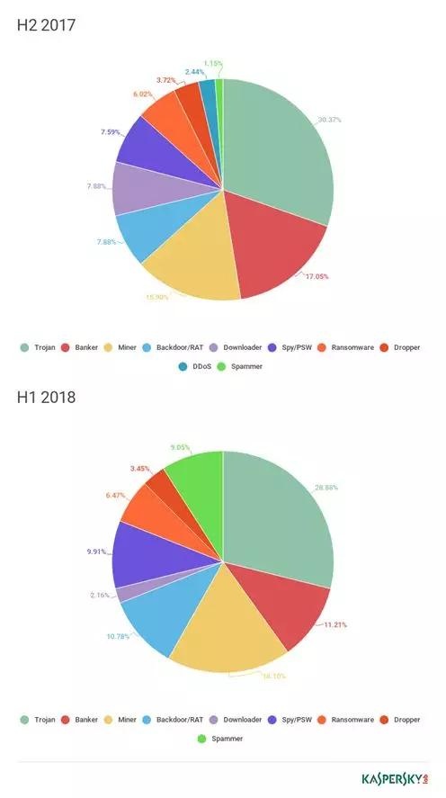 然而,犯罪分子对货币的兴趣也没有下降,证据就是Top 10列表中的Neutrino.POS和Jimmy。2017 H2,Neutrino.POS的占比为4.6%。2018年它的比例有所下降,但它的“表亲”Jimmy为银行木马贡献了1.1%的份额。