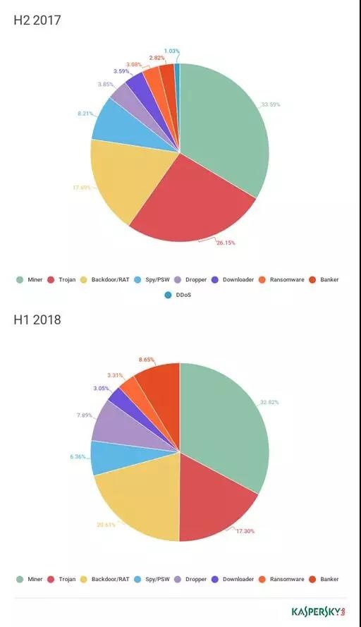 · 僵尸网络分发的文件中恶意矿工的比例正在增长。这是因为犯罪分子开始将僵尸网络视作恶意挖矿的工具。
