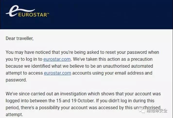 本周二欧洲之星高铁服务向客户发送邮件称,所有用户都需要在登录eurostar.com时重置其密码。采取该预防措施的原因是该公司疑似遭到黑客攻击。除了向客户发送警报之外,该公司没有发布任何有关该事件的公开声明,因此难以估计有多少客户受到影响。但该公司在邮件中称没有客户的信用卡或支付信息受到损害。