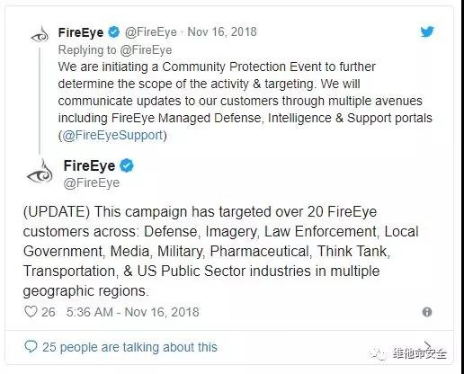 2018年11月14日FireEye检测到针对多个行业的20多个客户的新针对性钓鱼攻击,涵盖智库、执法机构、媒体、美国军方、图像、运输、制药、政府机构以及国防承包商等。这些钓鱼攻击利用伪装成来自美国国务院的钓鱼邮件,试图传播Cobalt Strike Beacon。根据对其TTP的分析,其背后的攻击组织疑为APT29。