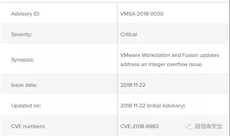 VMware修复天府杯上披露的虚拟机逃逸漏洞(CVE-2018-6983),该漏洞是一个整数溢出漏洞,成功利用该漏洞可导致虚拟机逃逸并在宿主机上执行代码。受影响的产品包括VMware Workstation、VMware Fusion等,VMware在Workstation版本 14.1.2/15.0.2及Fusion版本10.1.5/11.0.2中修复了该漏洞,建议用户尽快进行更新。