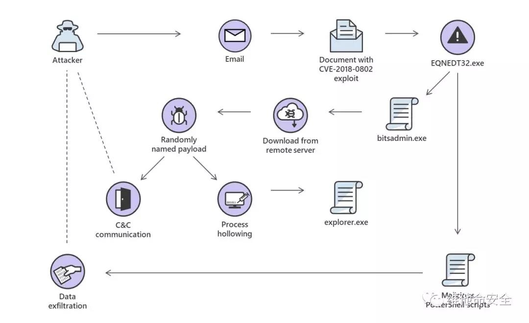 Windows Defender ATP团队发现一个针对亚洲能源、食品和饮料行业的新恶意攻击活动,基于对该活动的目标选择、攻击链以及工具集的分析,研究团队认为该活动是由APT组织Tropic Trooper发起的。攻击的初始向量是一个利用了Office公式编辑器漏洞CVE-2018-0802的恶意文档,攻击者随后使用bitsadmin.exe从远程服务器下载并执行随机命名的payload。研究人员认为这些payload的主要目的是窃取数据。