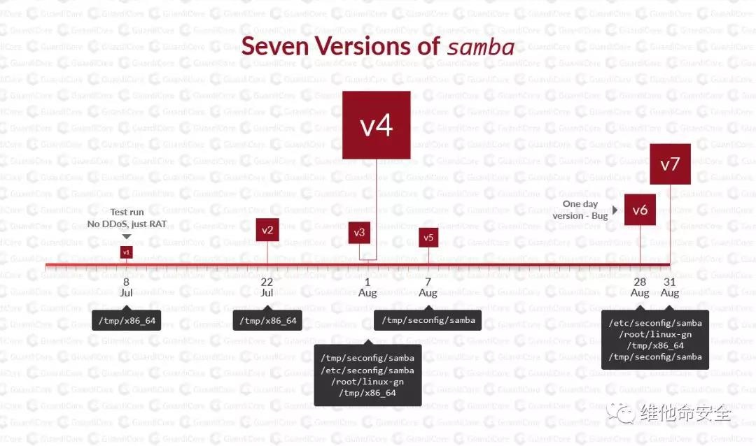 GuardiCore研究团队发现恶意攻击活动butter加入了新payload:samba木马。butter最早出现于2015年中期,其攻击来自于有限的几个IP,具体来说,只有4个IP被用于不同阶段的攻击活动。这些IP来自于香港和新加坡,并且自2016年以来一直与恶意活动相关联。butter早期的payload是80 RAT,但自2018年7月起开始使用samba木马。samba木马是典型的RAT,可以下载文件、执行shell命令、发起DDoS攻击以及具有升级机制。研究人员已经观察到了该木马的7个不同的版本。