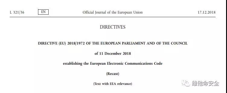 欧洲议会和理事会发布《欧盟电子通信规范(EECC)》,该规范是对2009年发布的现有电子通信立法框架的重新修订。欧盟成员国将有两年的时间将该规范的相关条款转换为本国的法律、法规和行政规定,这一最后期限是2020年12月。该规范的整体目标是“使欧盟在2025年站在互联网连接的最前沿-创建一个千兆社会”。该规范还包含对安全的规定条款:电子通信网络服务商需要采取相应的技术和机制,以最大限度地减少安全事件。