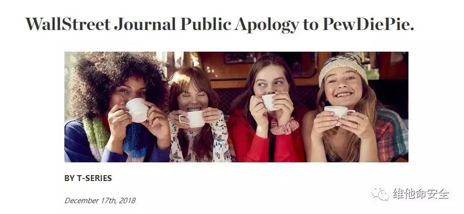 试图推广YouTube订阅频道PewDiePie的黑客活动进一步发酵,华尔街日报官网的一个页面被黑客篡改成“华尔街日报向PewDiePie公开道歉”。该网页与华尔街日报的新闻编辑室无关,而是属于其广告部门。华尔街日报被卷入这一事件的起因是2月份其曾报道过PewDiePie使用反犹太主义的图像和语言的新闻,PewDiePie随后曾反击称华尔街日报只是断章取义。华尔街日报没有披露更多攻击细节。