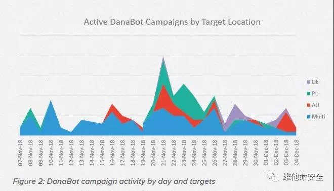 F5 Networks发现银行木马DanaBot在2018年11月7日至12月4日期间十分活跃,其目标涵盖了多个国家的多个行业,包括银行、电子邮件服务商和比特币交易所。DanaBot 88%的目标是银行用户,主要针对意大利,其次为波兰和德国。11%的目标为电子邮件服务商,主要针对美国。11月21日为DanaBot恶意活动的最高峰。
