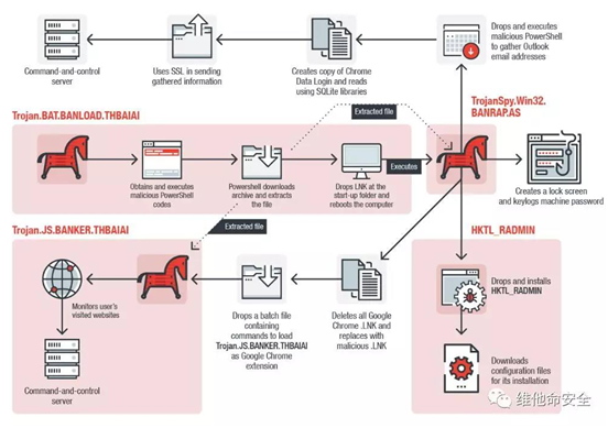趋势科技研究团队检测到一个新的无文件恶意软件Trojan.BAT.BANLOAD.THBAIAI,该恶意软件主要针对巴西和泰国的银行客户,并将收集到的银行账户信息发送至远程C&C服务器。此外,该恶意软件还会下载另外两个威胁,包括用于窃取Outlook电子邮件地址的TrojanSpy.Win32.BANRAP.AS以及用于获取管理员权限并监控屏幕活动的HKTL_RADMIN。
