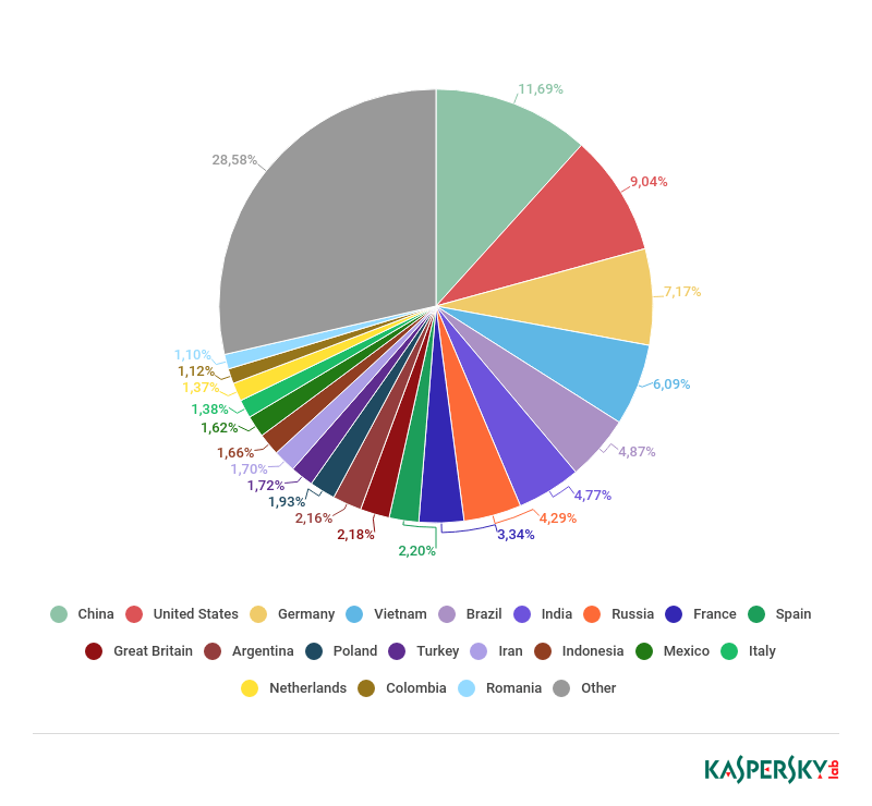 和往年一样,2018年的第一名是德国,其份额占所有攻击的11.51%。第二名是俄罗斯(7.21%),第三名是英国(5.76%)。