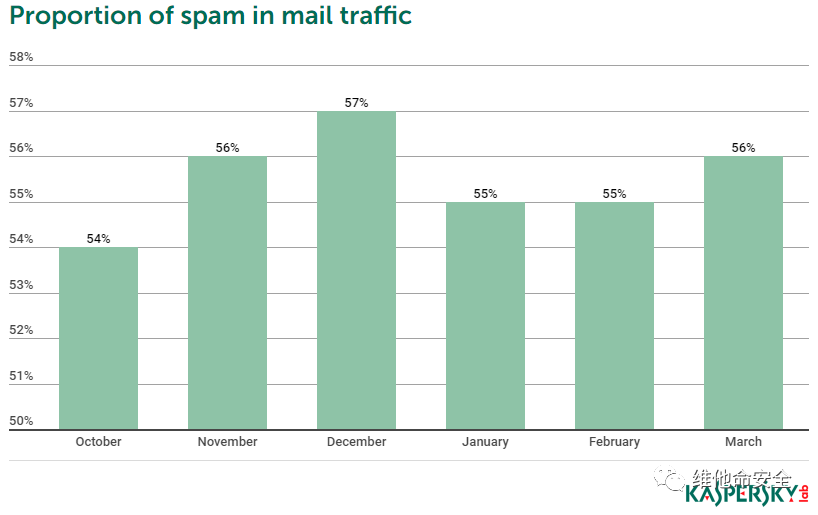卡巴斯基发布2019年Q1垃圾邮件和钓鱼攻击报告,在2019年第一季度,垃圾邮件在全球电子邮件流量中的平均占比略微增长了0.06个百分点,达 55.97%。卡巴斯基反钓鱼系统共阻止了111832308 个将用户重定向至钓鱼网站的攻击尝试,比2018年第四季度增长了35220650。攻击者继续利用全球媒体热点事件实施钓鱼攻击,并积极利用社交媒体平台进行传播。