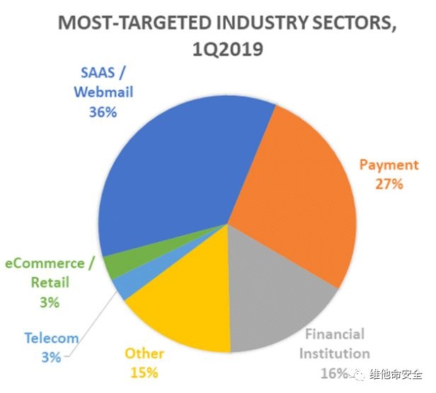 根据APWG的2019年Q1钓鱼攻击趋势报告,针对SaaS和网络邮件服务的钓鱼攻击增长至所有钓鱼攻击的36%,首次超过了支付系统类别(本季度该类别遭到的钓鱼攻击占27%)。APWG高级研究员Greg Aaron表示,钓鱼者对SaaS网站登录凭据的兴趣是因为他们可以通过鱼叉式钓鱼获得财务数据和个人信息。2019年Q1检测到的钓鱼网站总数是180768,比2018年Q3的151014和Q4的138328要高。