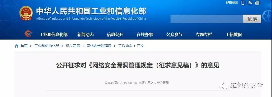 工信部发布《网络安全漏洞管理规定(征求意见稿)》;WebLogic(CVE-2019-2729)漏洞补丁