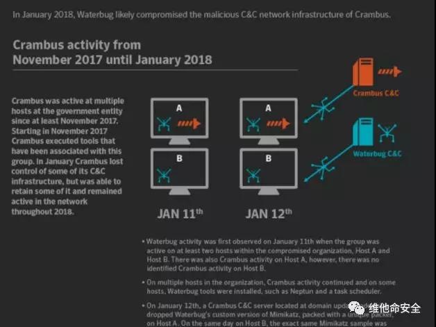根据赛门铁克的报告,俄罗斯Turla APT在2017年入侵了伊朗APT34的基础设施,并利用其C&C服务器使用自己的恶意软件二次感染APT34的受害者。研究人员于2018年1月11日观察到该入侵活动的首个证据,当时Turla向APT34的受害者释放了一个恶意工具(名为msfgi.exe的任务调度程序)。Turla在该网络上的活动一直持续到2018年9月,但APT34似乎没有发现该入侵,没有证据表明APT34做出了任何反应。