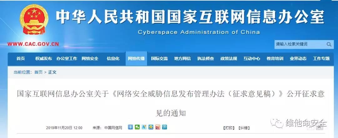 为有效应对网络安全威胁和风险,保障网络运行安全,国家互联网信息办公室20日就《网络安全威胁信息发布管理办法(征求意见稿)》公开征求社会意见,对发布网络安全威胁信息的行为作出规范。根据征求意见稿,网络安全威胁信息包括(一)对可能威胁网络正常运行的行为,用于描述其意图、方法、工具、过程、结果等的信息;(二)可能暴露网络脆弱性的信息。征求意见稿明确,发布网络安全威胁信息,应以维护网络安全、促进网络安全意识提升、交流网络安全防护技术知识为目的,不得危害国家安全和社会公共利益,不得侵犯公民、法人和其他组织的合法权益。