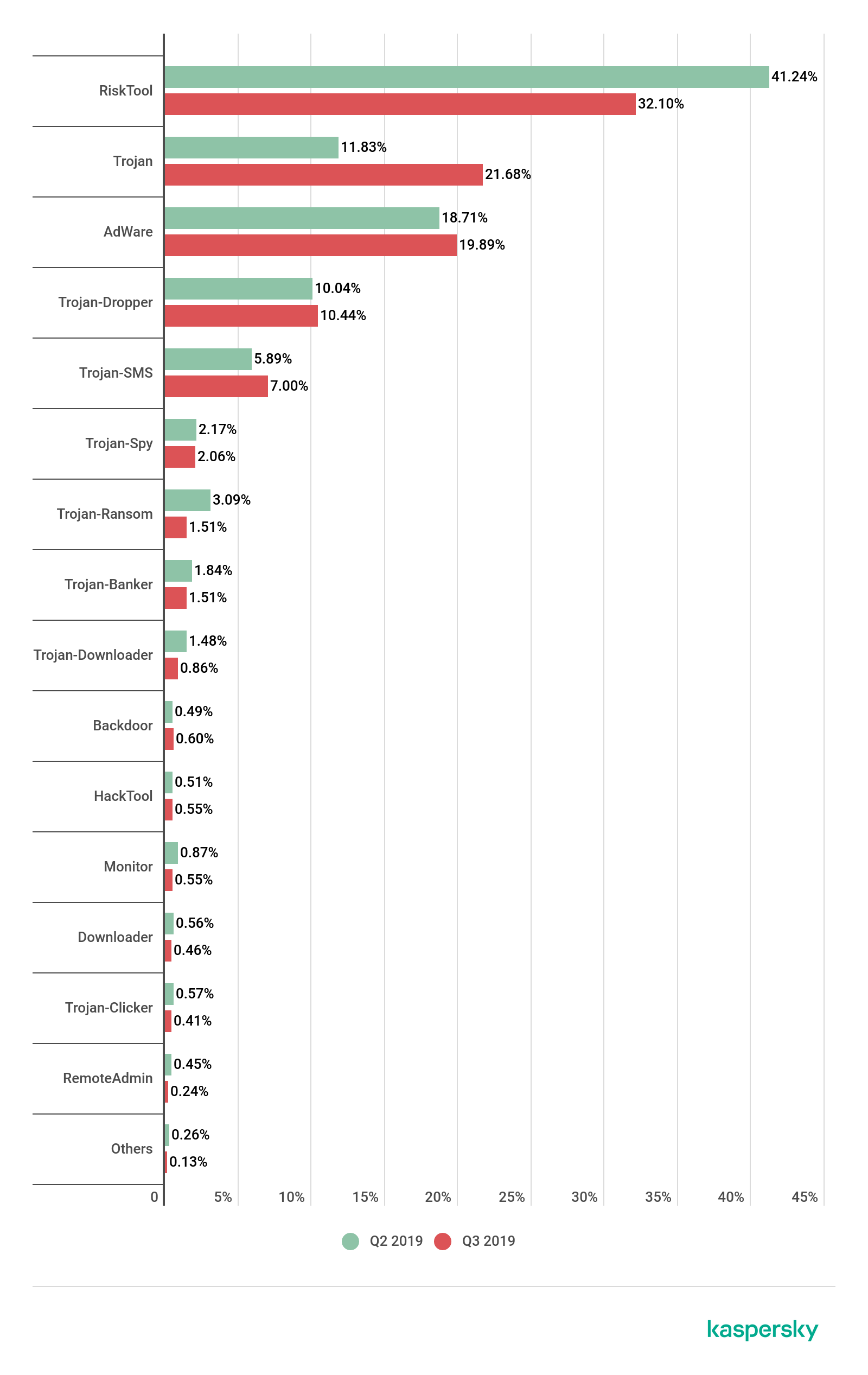 2019年Q2和Q3,卡巴斯基检测到的移动恶意APP的类型分布