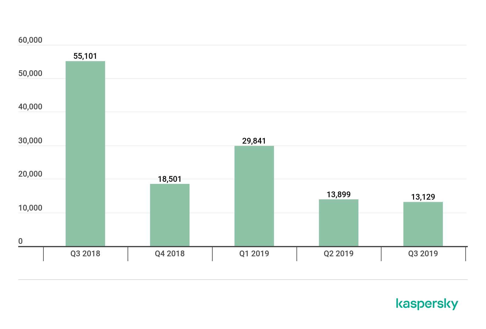 2018年Q3 – 2019年Q3,卡巴斯基检测到的恶意软件安装包数量