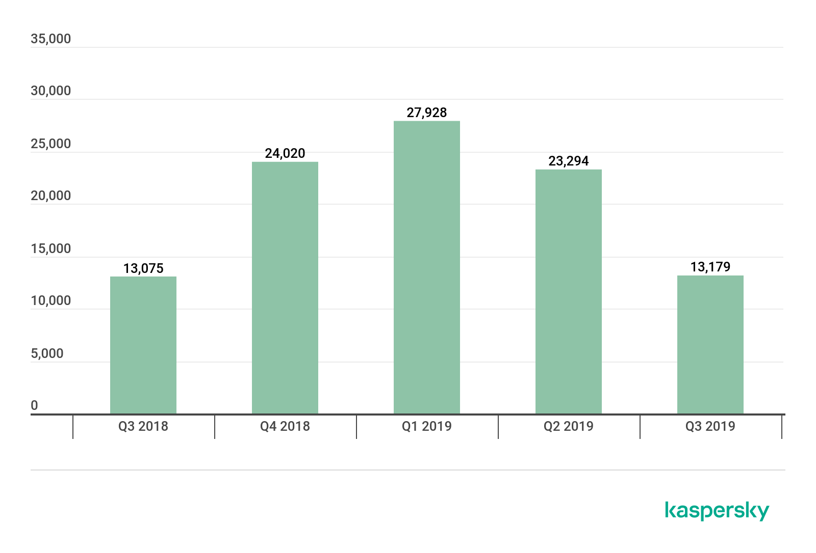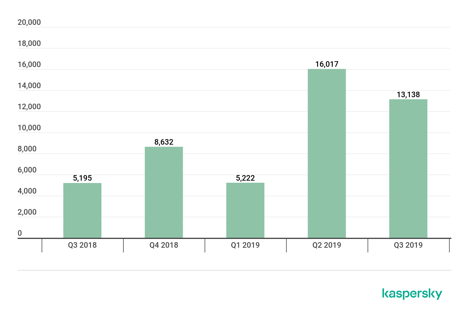 虽然在前几个季度中卡巴斯基观察到新安装包的数量显著下降,但Q3的数字与Q2相比上升了117,067(11.7万)。