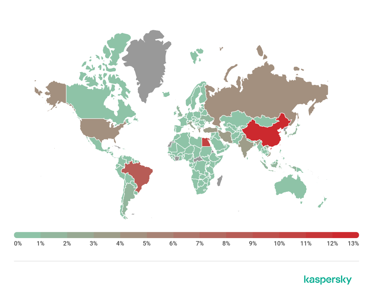 为了评估不同国家的用户面临的在线感染风险,卡巴斯基统计了该国家Web反病毒组件被触发的用户百分比。由此产生的数据表明了不同国家网络环境的侵略性。