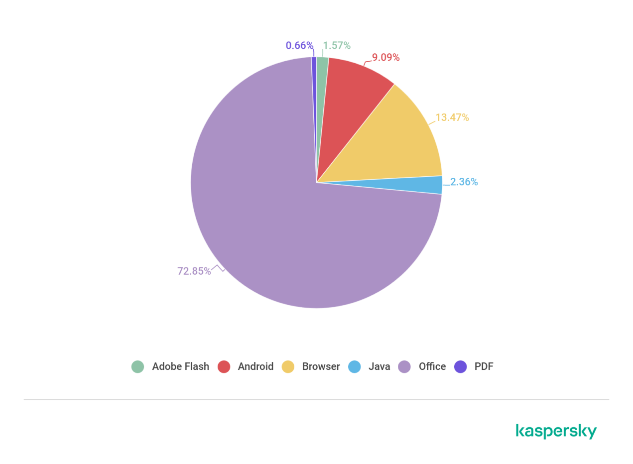 现代浏览器是复杂的软件产品,这意味着不断有新的漏洞被发现和用于攻击(占13%)。最常见的目标是微软IE浏览器,其漏洞常在野外被利用。本季度新发现的一个0day是CVE-2019-1367,该漏洞可导致内存损坏并允许在目标系统上远程执行代码。该漏洞十分严重,以致于微软为它发布了计划外更新。谷歌Chrome在本季度也未能逃过,它也在更新中修复了多个关键漏洞(CVE-2019-13685、CVE-2019-13686、CVE-2019-13687和CVE-2019-13688),其中一些漏洞允许攻击者绕过浏览器的沙箱保护在系统中执行任意代码。