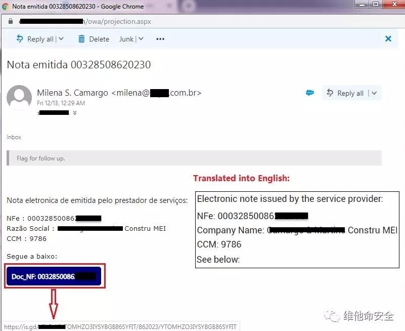 FortiGuard Labs发现恶意软件Metamorfo的新变种,该恶意软件以收集巴西金融机构客户的数据而闻名。该变种通过钓鱼邮件传播,钓鱼邮件由巴西官方语言葡萄牙语写成,内容为督促受害者下载电子发票(NF),但实际下载的文件为XlsPlan_Visualize.msi。该MSI文件只是一个恶意软件下载器,最终将下载KJFLDKRE.msi并执行,该文件是真正的Metamorfo恶意软件。该恶意软件可以收集受害者的计算机名称、客户端版本、操作系统名称、账户密码等数据并发送至C&C服务器。