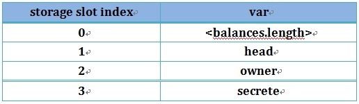 在BelluminarBank合约中,一共有4个全局变量,分别是balances、head、owner、secrete。它们的默认访问属性是private,看上去只有合约自己能够访问这些变量。事实上,合约的所有变量数据都是公开存储在链上的区块中,任何人都可以通过访问存储数据来获得这些变量的值[2]。在solidity语言中,全局变量都存储在storage中,根据solidity的变量存储规则,定长的变量在storage中是顺序存储的,数组变量在storage中其索引位置存放的是其数组长度(参见[3])。该合约storage中的变量存储布局如下: