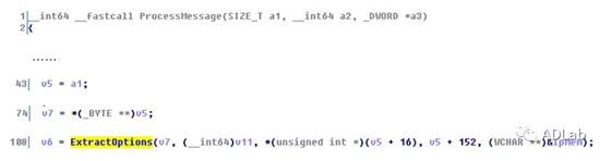 DHCP服务在处理Vendor Specific 类型(Type=43)的Option结构存在安全漏洞。首先看下DHCP服务程序对Option的处理过程, ProcessMessage函数负责处理收到的DHCP报文,调用ExtractOptions函数处理DHCP的Option字段,传入函数ExtractOptions的参数1(v7)为DHCP报文指针,参数3(*(unsigned int *)(v5 + 16))对应指针偏移位置+16的数据,即Len字段。