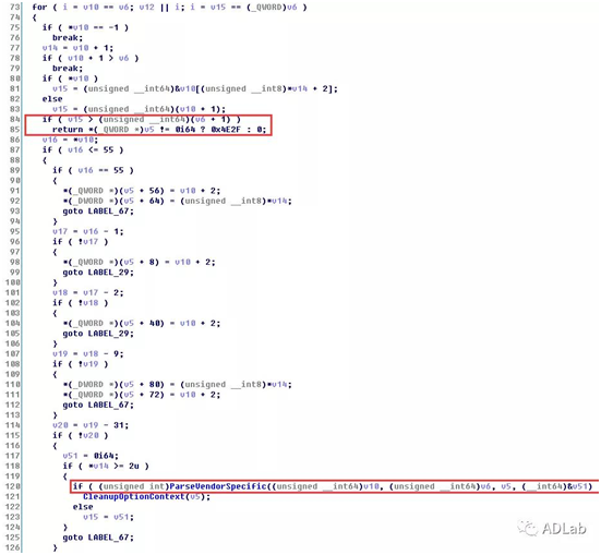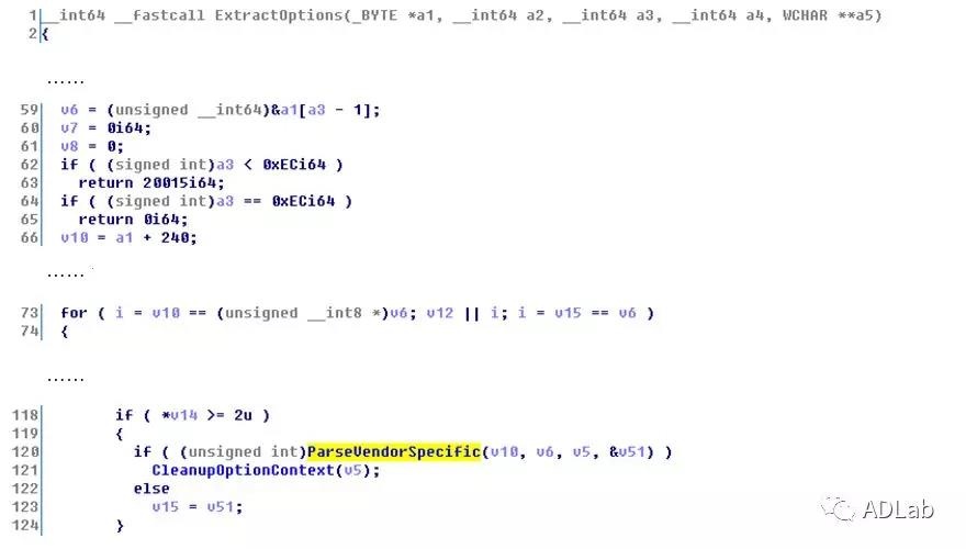 ExtractOption函数如下所示。 v6 = (unsigned __int64)&a1[a3 - 1];指向报文末尾位置;v10=a1+240;指向报文中Option结构。在for循环中处理不同类型的Option结构,当type=43(Vendor Specific Information),传入指针v10和指针v6作为参数,调用ParseVendorSpecific函数进行处理。