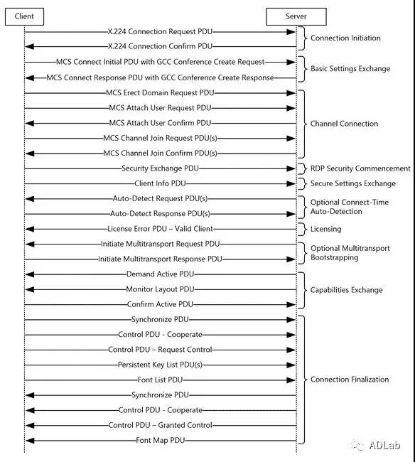 RDP协议的连接流程可以分为10个不同的阶段。这里我们关注通道连接相关的几个阶段。