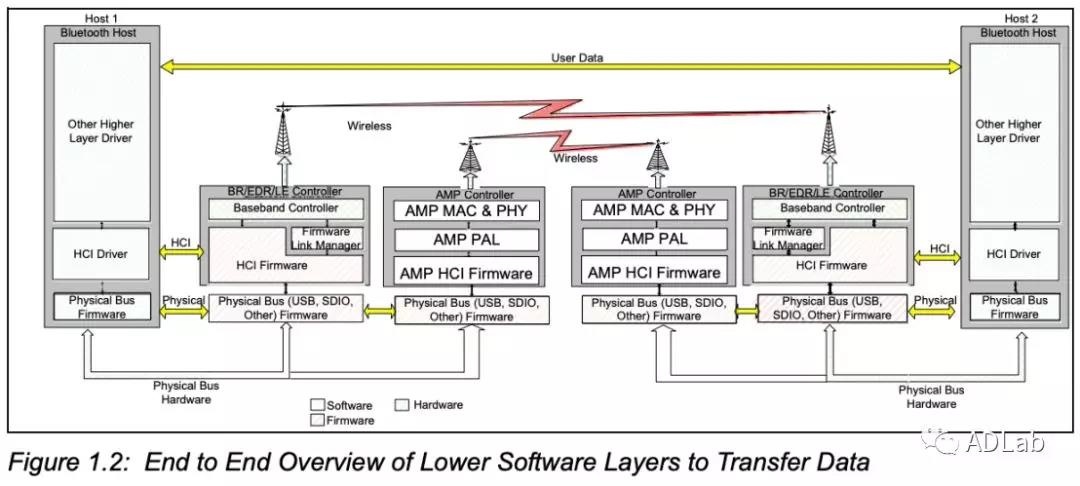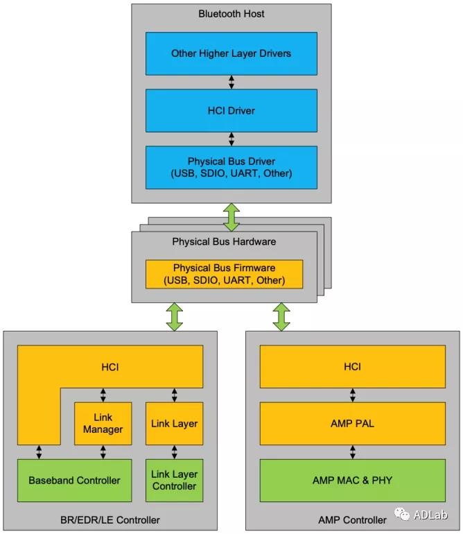 HCI 层位于蓝牙协议栈高层协议和低层协议之间,提供了对基带控制器和链路管理器的命令以及访问蓝牙硬件的统一接口方法,其接口适用于BR/EDR控制器、BR/EDR/LE控制器、LE控制器、AMP控制器,与底层的结构关系如下图: