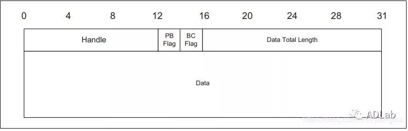 根据需要,这里只介绍ACL数据包格式,ACL 数据用于主机和控制器之间的非同步数据交换,如播放音乐数据的数据包,格式如下图: