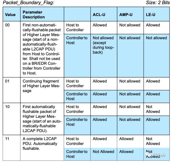 设置为 00'b 的时候,代表 Host -> Contoller 的 L2CAP 的首包。设置为 01’b 的时候,代表 Host -> Contoller 或者 Contoller -> Host 的 L2CAP 的续包(中间的)。设置为 10'b 的时候,代表 Contoller -> Host 的 L2CAP 的首包。