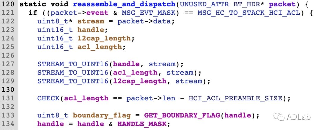 首先,处理第一个packet,代码127行到129行,分别读取handle、acl_length和l2cap_length。handle为本次链路的Connection_Handle。根据前文数据包格式的介绍,acl_length为Data Total Length,该data数据域中存放着L2CAP数据包分片(也可能是一个完整的L2CAP数据包)。然后,直接读取data中L2CAP Length,该l2cap_length是一个完整的L2CAP数据包中payload的长度。行131,校验packet包长度是否正常。行133,通过handle获取boundary_flag,即是PB Flag。