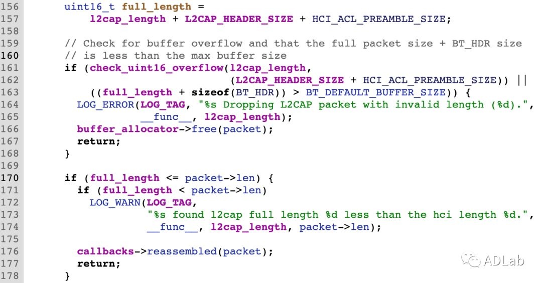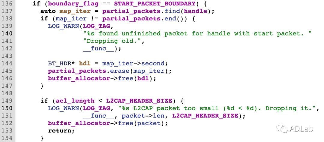 行136,判断boundary_flag是否为2,二进制表示为10’b,即判断当前packet是否为 Contoller -> Host 的 L2CAP 的首包,如果是,进入if语句。行137到行147,判断当前packet是否已经被处理,保证本次处理的packet都是最新的。行149到行154,判断L2CAP数据包长度是否正常,不正常直接报错返回。