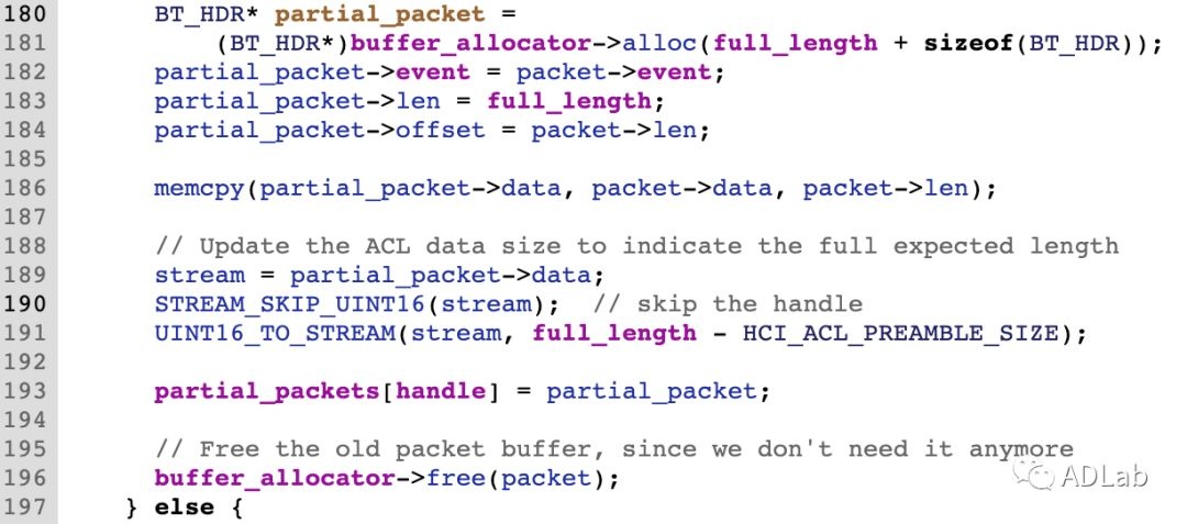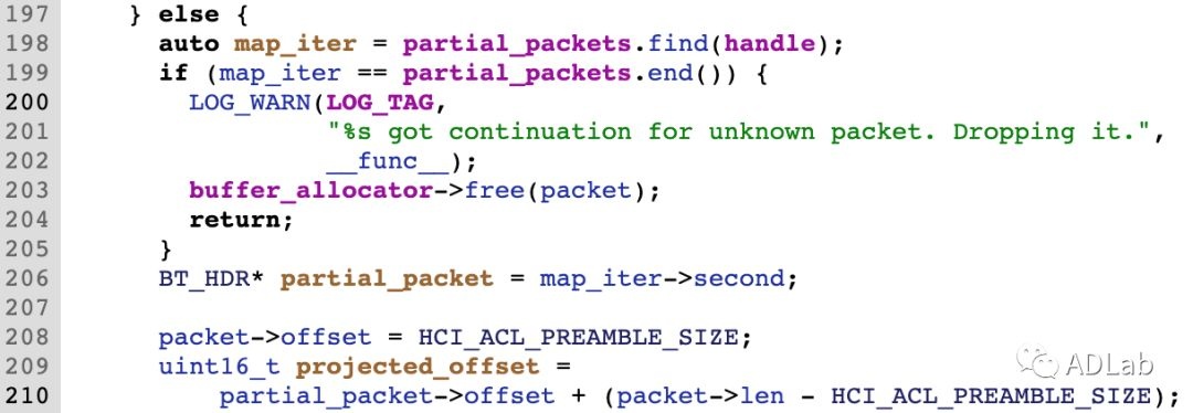 如果当前头包packet后面还有续包,那就开始重新分配一块新的内存用于packet中数据包重组。行180到184,分配并设置partial_packet,将partial_packet->len设置为full_length,将partial_packet->offset设置为packet->len即当前头包packet->data的长度。行186,调用memcpy,将头包packet中HCI数据包整体拷贝到partial_packet中。行189到行191,先找到HCI数据包头部,并跳过handle,更新acl_length为一个完整的L2CAP数据包长度。行193,将partial_packet存放到容器中。行196,释放当前头包packet,表示已经处理完第一个packet,不再需要它了。行197,else语句开始处理后续packet,即boundary_flag不等于2的packet。