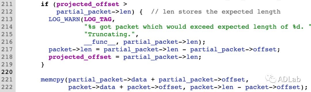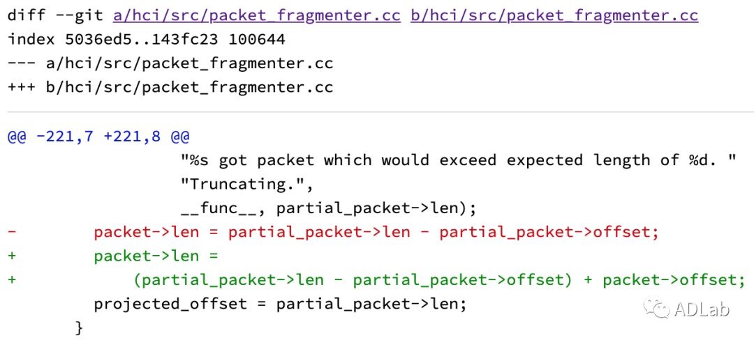 修正好实际要拷贝的长度后,行221,调用memcpy进行拷贝,漏洞点到了,第一个参数为partial_packet->data + partial_packet->offset,目的地址是正确的,第二个参数为packet->data + packet->offset,源地址也是正确的,第三个参数是要拷贝的长度len为packet->len - packet->offset,这个值是有问题的,分两种情况。第一种情况是projected_offset小于partial_packet->len,packet->len - packet->offset为L2CAP数据包片段总长度,并且是个正数。第二种是行211的情况,packet->len已经被修正过,不需要再一次packet->len - packet->offset的操作,如果partial_packet剩余空间长度小于4字节,那packet->len - packet->offset 是小于零的,是一个负数。由于memcpy()函数第三个参数类型是一个无符号整型类型,因此整数溢出导致堆溢出。漏洞补丁如下: