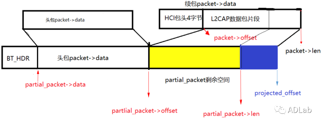 行198到行205,首先通过handle判断当前后续packet是否属于本次链路的,如果不属于,直接返回。行206,获取前一轮生成的partial_packet。行208,将当前后续packet->offset赋值为HCI_ACL_PREAMBLE_SIZE即4字节,此时packet->offset指向HCI包中的data域,里面存放着L2CAP数据包分片。行209和行210,计算projected_offset,projected_offset为partial_packet->offset与本次L2CAP数据包分片的长度之和。