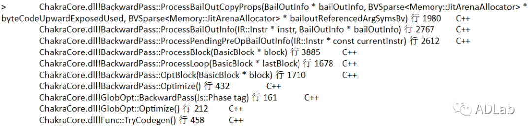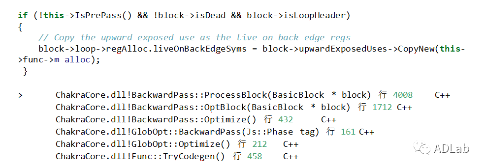 再之后,在JIT BackwardPass这样从后向前的优化过程中,Block 5的upwardExposedUses通过访问blockOptData->capturedValues->copyPropSyms,把s6->s10这一键值对加入。其栈回溯位于: