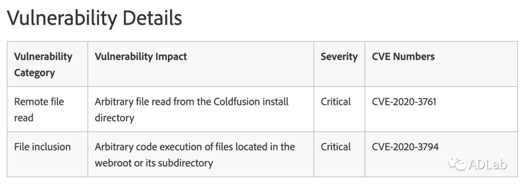 2020年3月18日,Adobe官方发布针对Adobe Coldfusion的安全更新补丁,编号为APSB20-16。补丁中包含启明星辰ADLab发现并第一时间提交给官方的Critical(危急)漏洞,Adobe ColdFusion 任意文件读取(CVE-2020-3761)和任意文件包含(CVE-2020-3794)漏洞。如下图所示: