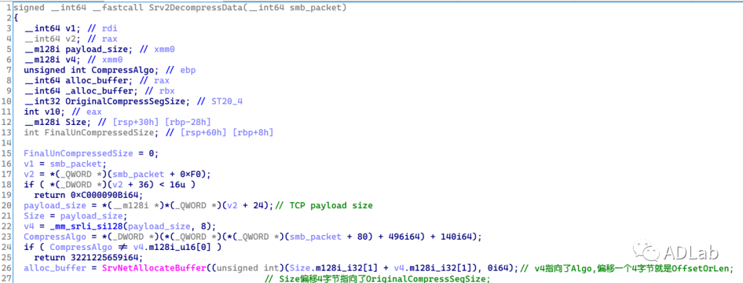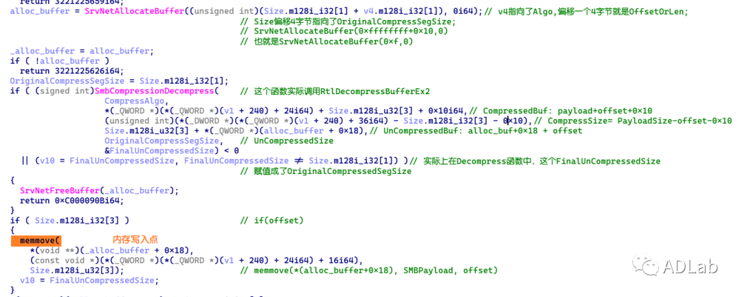 这里,OriginalCompressedSegmentSize+Offset可能小于实际需要分配的内存大小,从而在后续调用解压函数SmbCompressionDecompress过程中存在越界读取或者写入的风险。