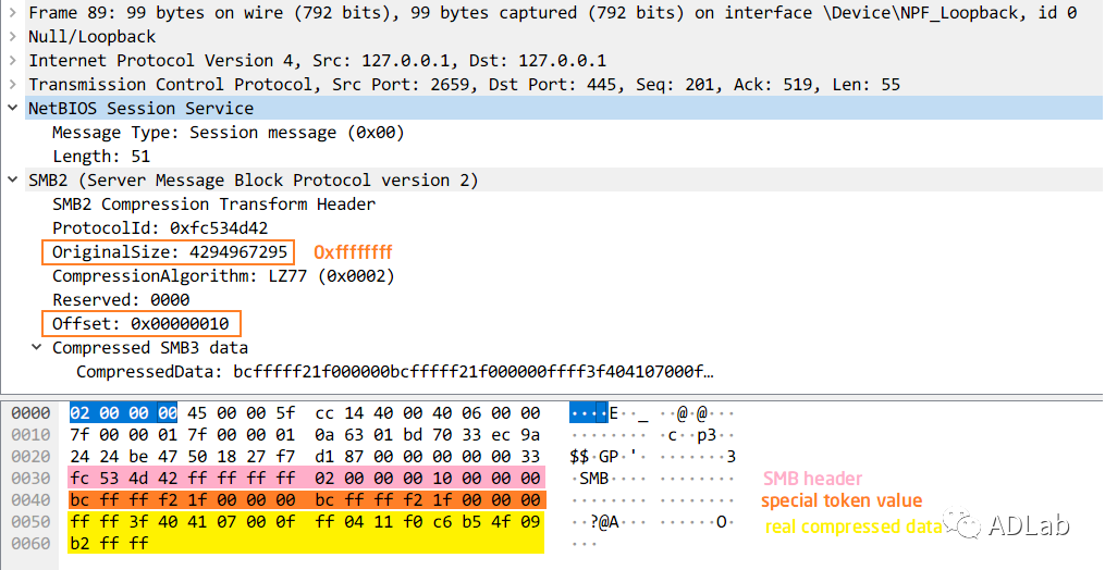 SMB3 raw data:实际上是由2个8字节的0x1FF2FFFFBC(总长0x10)加上0x13字节的压缩数据组成。