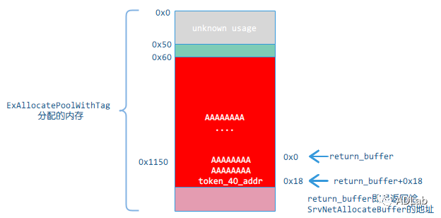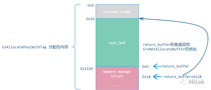 这里需要注意如下的数据关系:SrvNetAllocateBufferFromPool函数返回值return_buffer指向一个内存数据结构,该内存数据结构起始地址同实际分配内存(函数ExAllocatePoolWithTag分配的内存)起始地址的的偏移为0x1150;return_buffer+0x18位置指向了实际分配内存起始地址偏移0x50位置处,而最终return_buffer会作为函数SrvNetAllocateBuffer的返回值。其内存布局关系如图12。