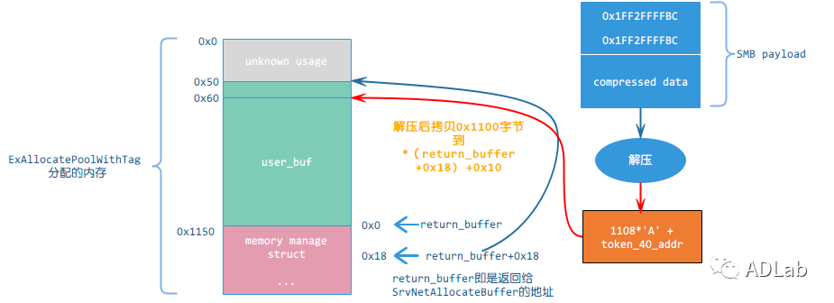 从反编译代码可以看出,函数SmbCompressionDecompress中保存解压后数据的地址为*(alloc_buffer+0x18)+0x10的位置,根据内存分配过程分析,alloc_buffer + 0x18指向了实际内存分配起始位置偏移0x50处,所以拷贝目的地址为实际内存分配起始地址偏移0x60位置处。