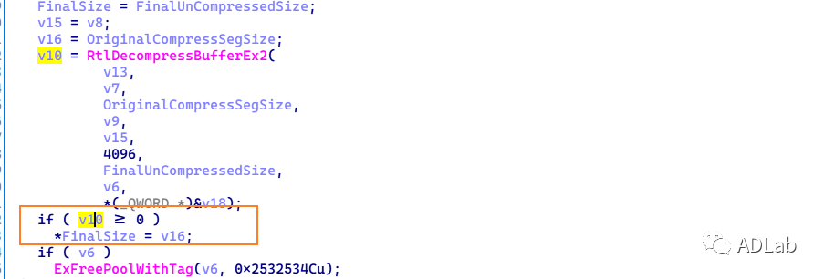 还有一个细节需要注意,在解压时,Srv2DecompressData函数会判断实际的解压后数据大小FinalUnCompressedSize是否和数据包中原始数据大小OriginalCompressedSegmentSize一致,如图16所示。