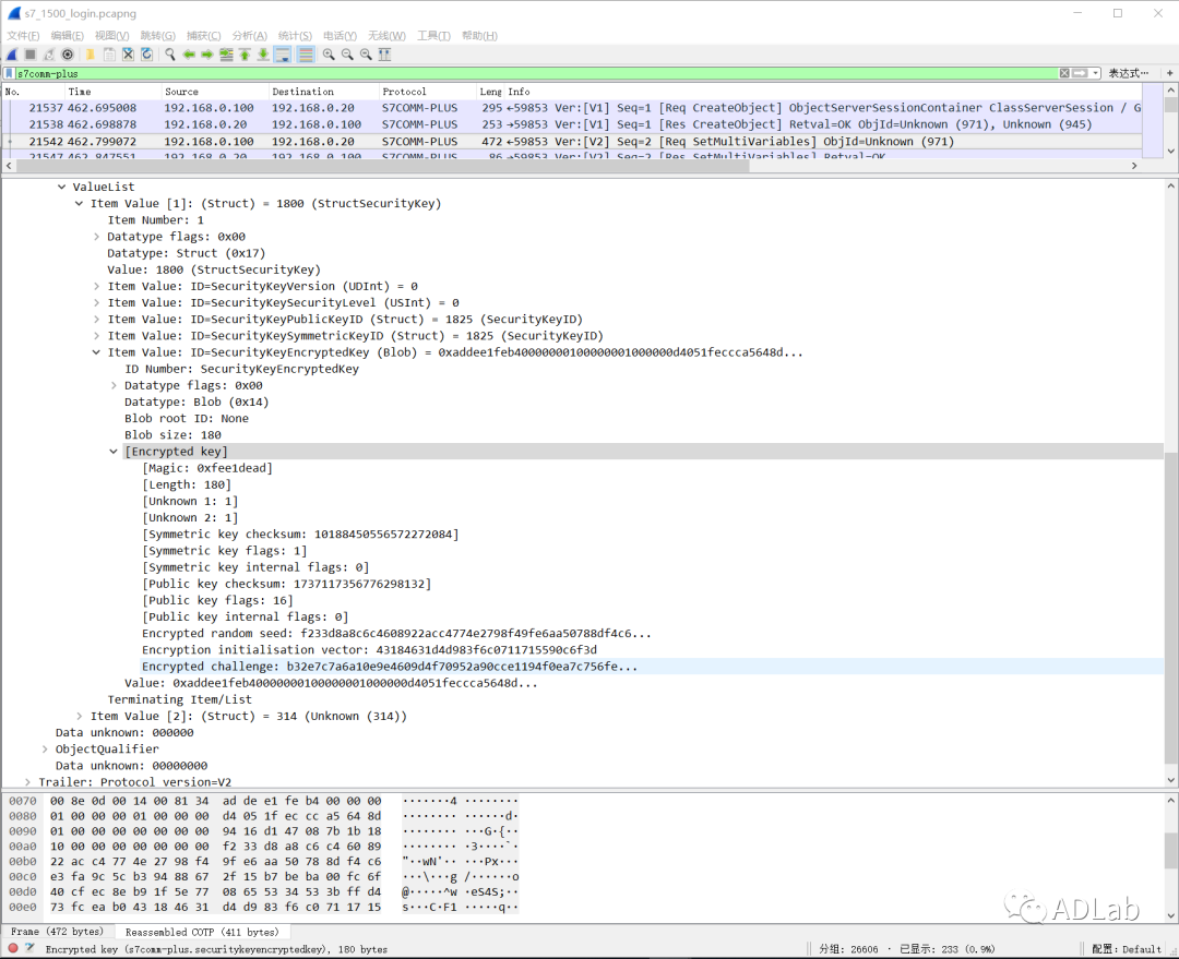 (3)TIA收到M2后,将向PLC发送M3,M3中包含SecurityKeyEncryptedKey(图4中红色框所示)。其中,Magic字段为0xfee1dead,长度180字节。SecurityKeyEncryptedKey里包含3个关键的加密字段(图4中蓝色框所示)。