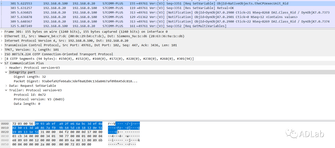 四次握手认证完成后,TIA向PLC发送功能码数据包,功能码数据包中包含IntergrityPart字段,如图5所示。PLC收到功能码数据包后,首先校验IntergrityPart字段,若校验通过,执行相应功能码。