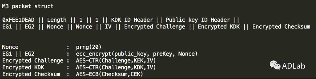 主机(TIA)随机生成20字节的PreKey,使用类椭圆曲线加密算法和公钥加密PreKey,作为Keying materaial 1(对应图7中M3数据包的EG1、EG2)。