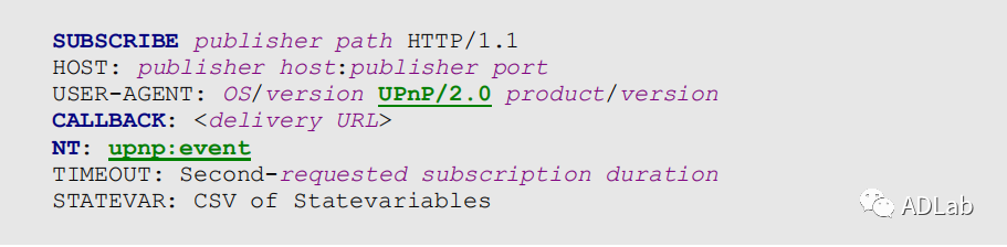 假设我们已经通过一些方法(如在局域网广播等)获得了某些设备UPnP服务的eventSubURL,下面就可以向UPnP设备发起一项订阅服务,格式如下: